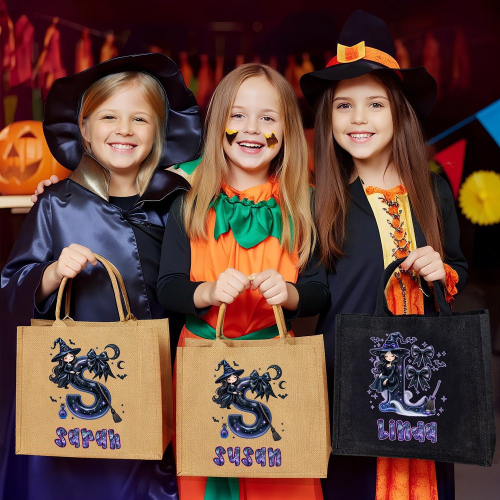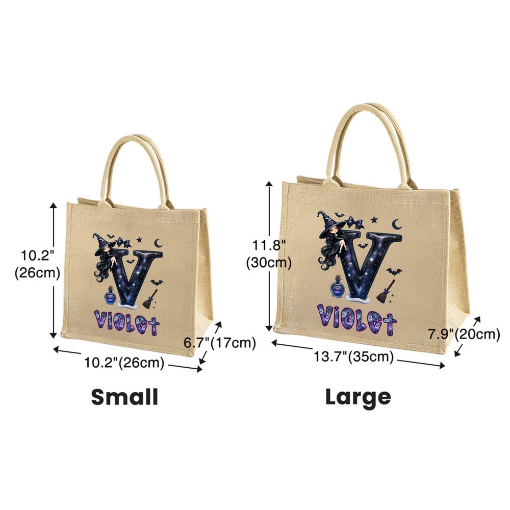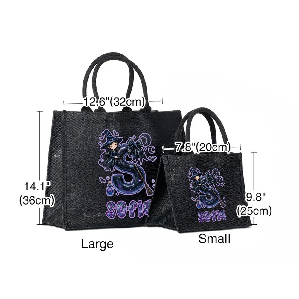 Personalisierte niedlichen Cartoon Hexe Ribbon Initial Jute Tote Tasche mit Namen Halloween Party Geschenk für Mädchen Frauen