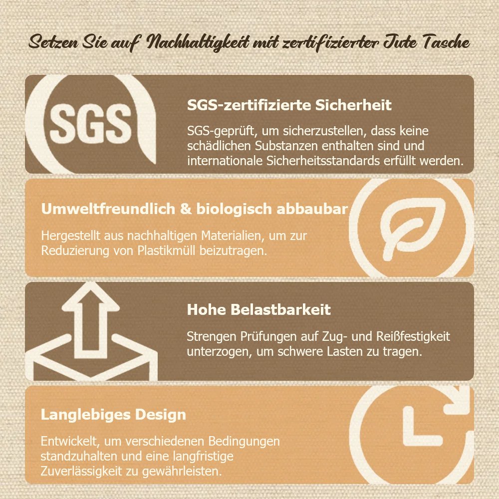 Diese wiederverwendbare Tragetasche aus nachhaltigem Jutegewebe leistet einen wertvollen Beitrag zum Umweltschutz, da sie den Bedarf an Papier- und Plastiktüten deutlich reduziert. Ihre robuste Verarbeitung sorgt dafür, dass sie den täglichen Gebrauch problemlos meistert und zugleich umweltfreundliche Praktiken unterstützt.